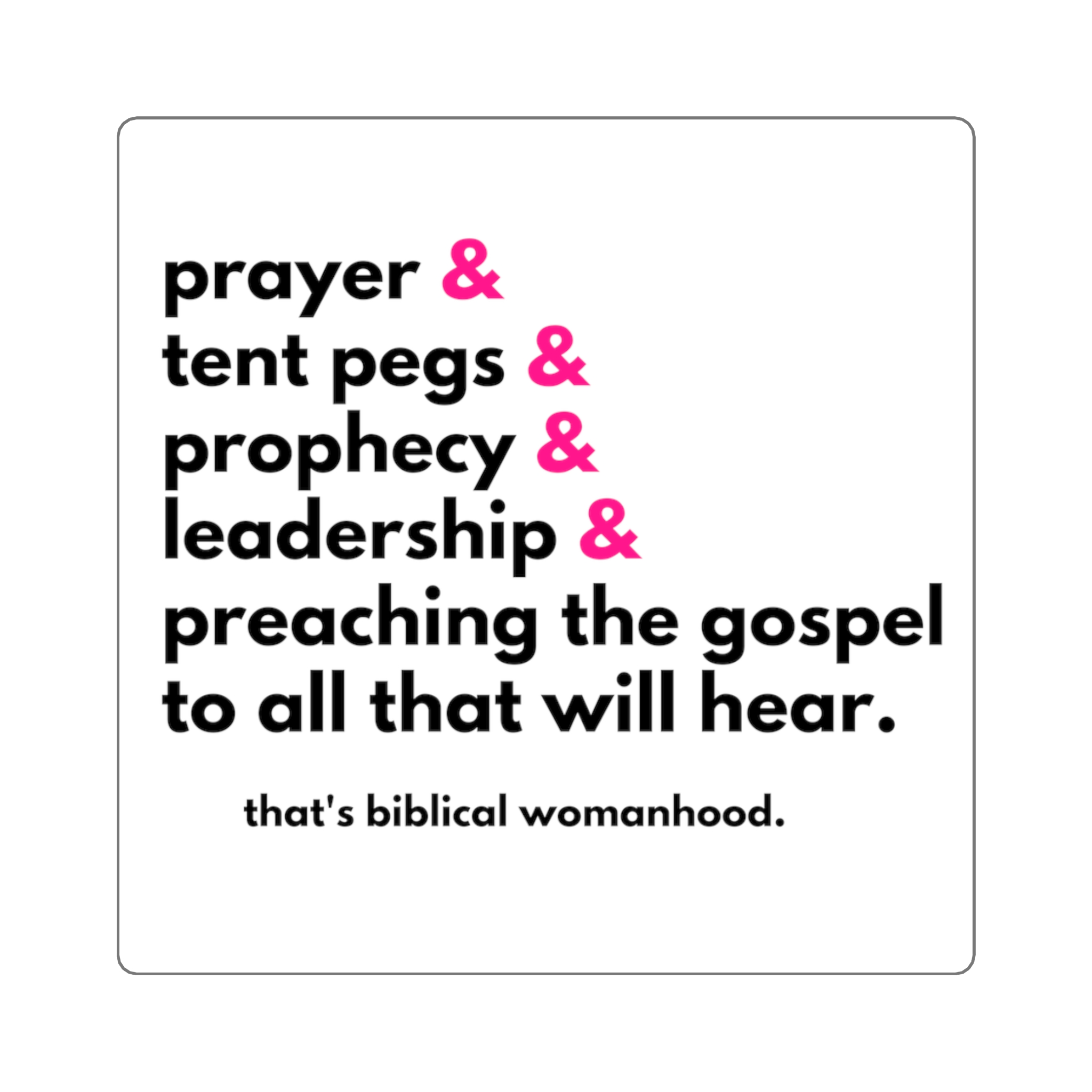 Adorn your computer, phone, coffee mugs, water bottles and more with this tongue-in-cheek statement about the often overlooked aspects of biblical womanhood.